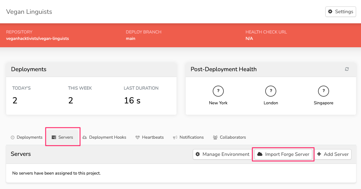 Next, we'll need to import the site from Forge. Head to your new project's page, open the "Servers" tab, and then click "Import Forge Server":