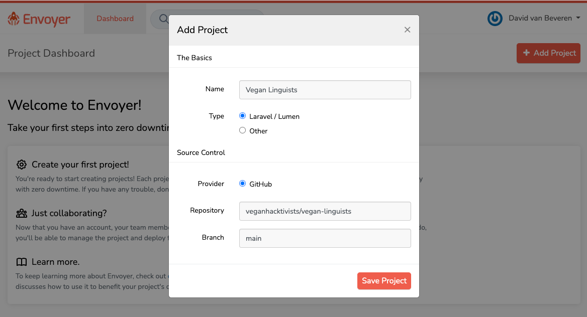 First, you'll need to be logged into Laravel Envoyer with the admin account. On the dashboard page, click "Add Project" and fill in the details of the project's GitHub repository: