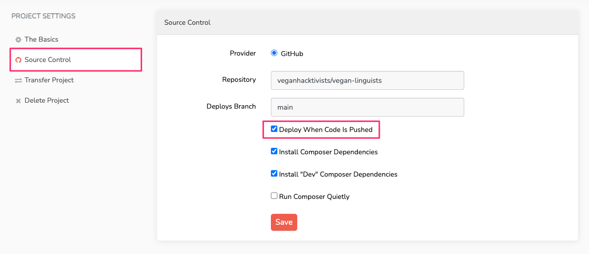 Then, head to the "Source Control" tab and check "Deploy When Code Is Pushed" and save the project settings:
