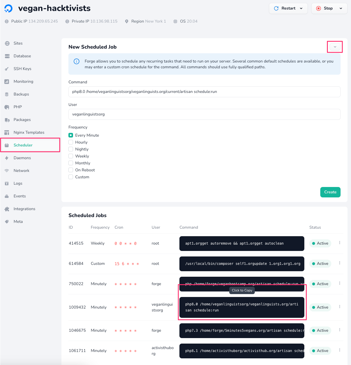 Head over to the "Scheduler" section for the server on Forge and copy the scheduler command for your project: