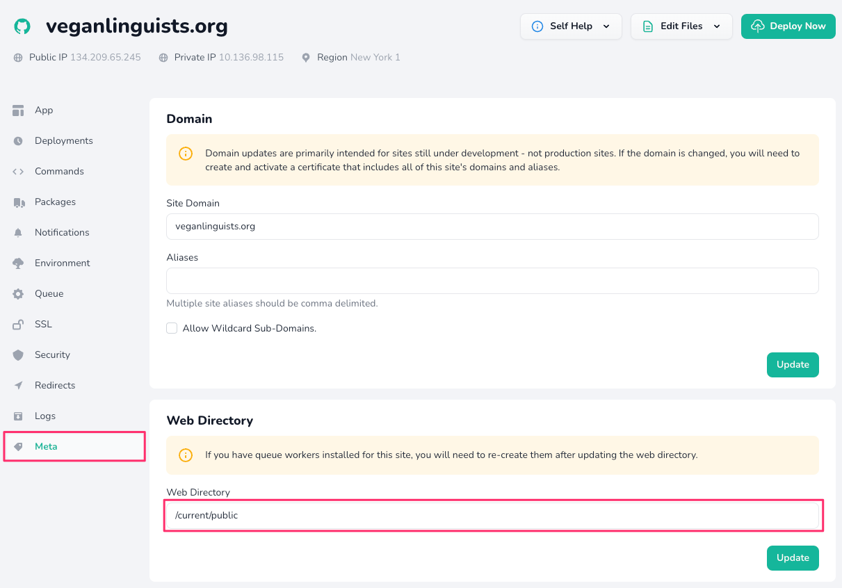 Once it's done, open the "Meta" tab for your project on Laravel Forge and prepend the "Web Directory" with /current: